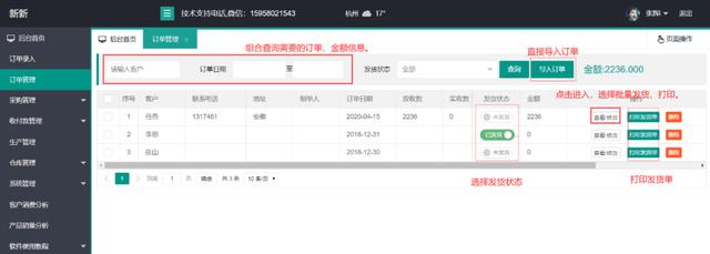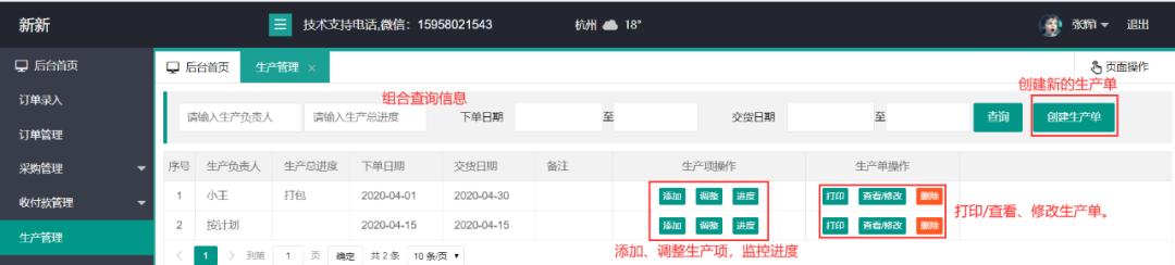 2.生产管理部门查看并管理订单,再根据工厂产能排定生产计划(总数及细目之订单号、产品、数量、交期),根据计划将需要生产的订单在生产管理功能里添加到生产单中。